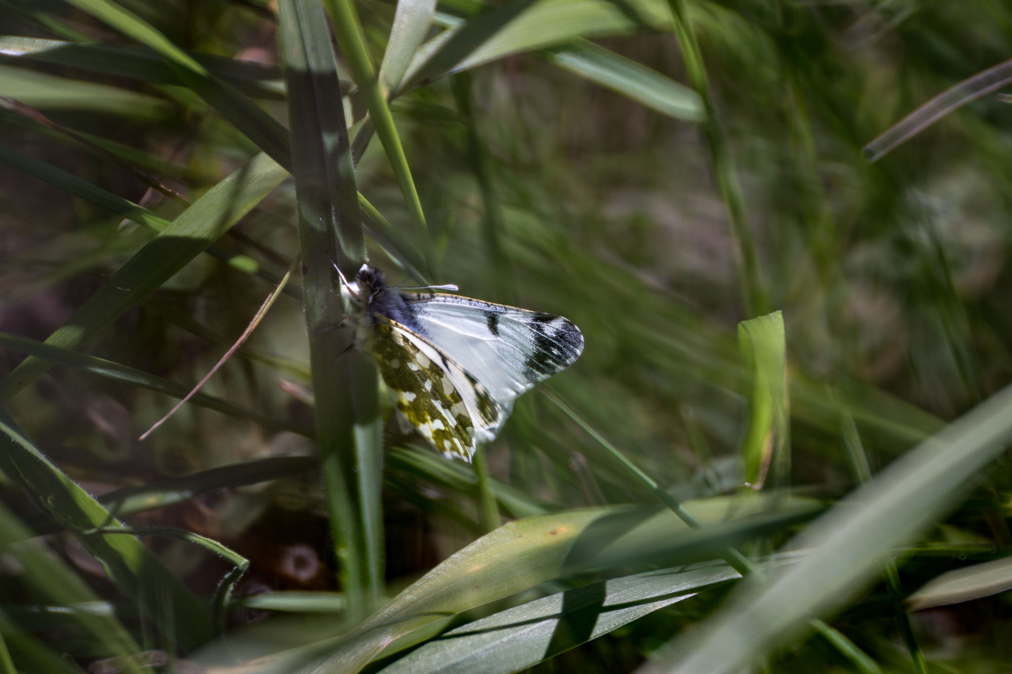 Fewer than 200 individual Island Marble Butterflies are known to exist, so the likelihood that the field-trip group would actually spot one seemed very low. But we got lucky! Tour leader Kathleen Foley (SJPT’s Stewardship Manager) had arranged for the group to meet with NPS biologist Jenny Shrum. Jenny is part of a captive rearing program based at American Camp. Just that morning, two Island Marbles had emerged from the chrysalis stage in the program’s lab. Jenny answered questions from the group while she opened two containers. From each of these, she plucked the newly emerged butterflies and placed them carefully on their favorite plant: field mustard, which was just beginning to open its yellow blossoms in a fenced-off plot.