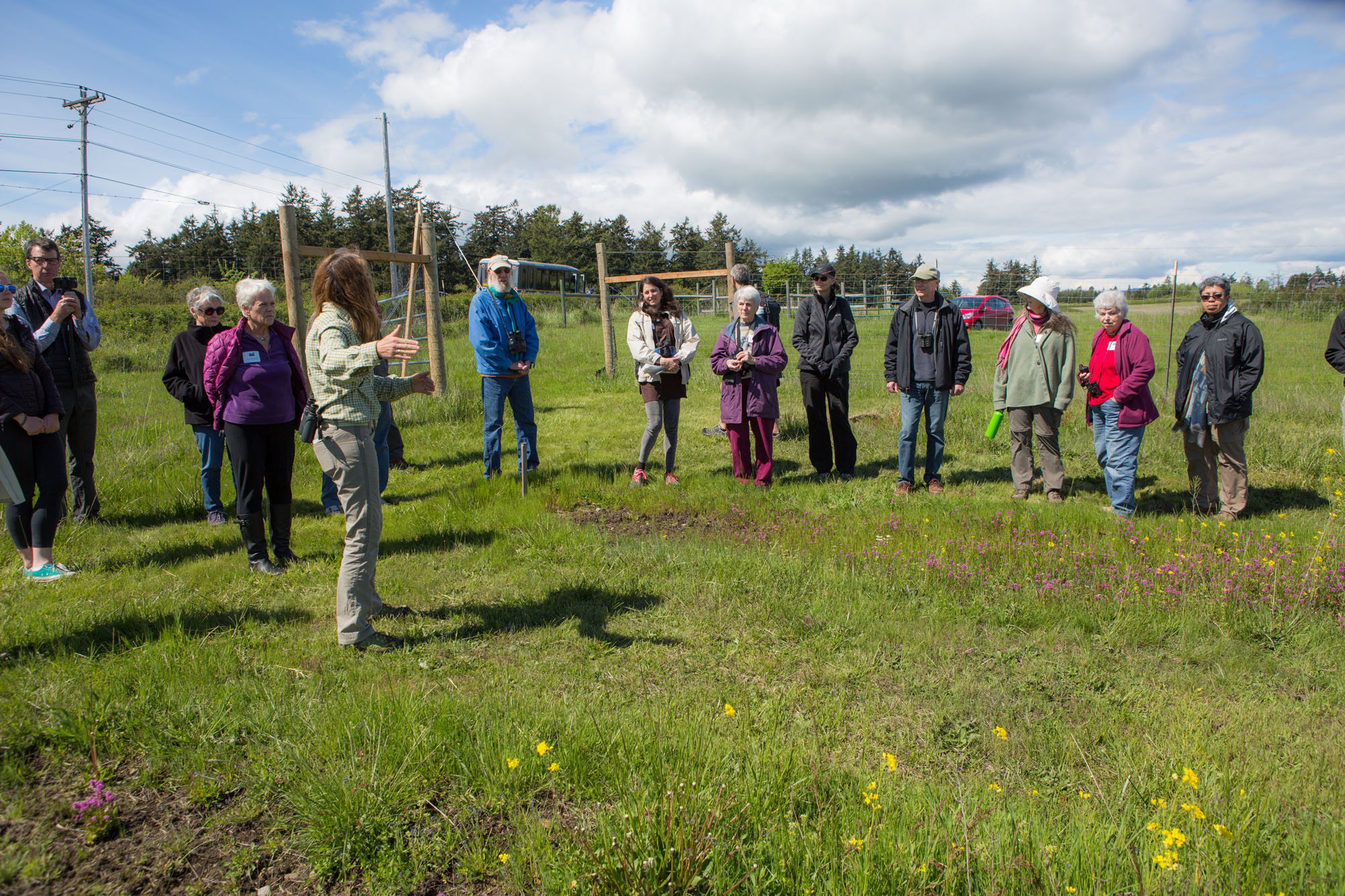 The next stop on the tour was the County Land Bank’s Frazer Homestead Preserve, not far from American Camp. There, Kathleen Foley has planted several Island Marble butterfly test plots, sowing seeds of field mustard and other nectaring plants that are native to local grasslands. The hope is that some intrepid Island Marble females will lay eggs in these plots, thereby spreading the tiny population beyond American Camp, where a single harsh natural event could potentially wipe out the species.