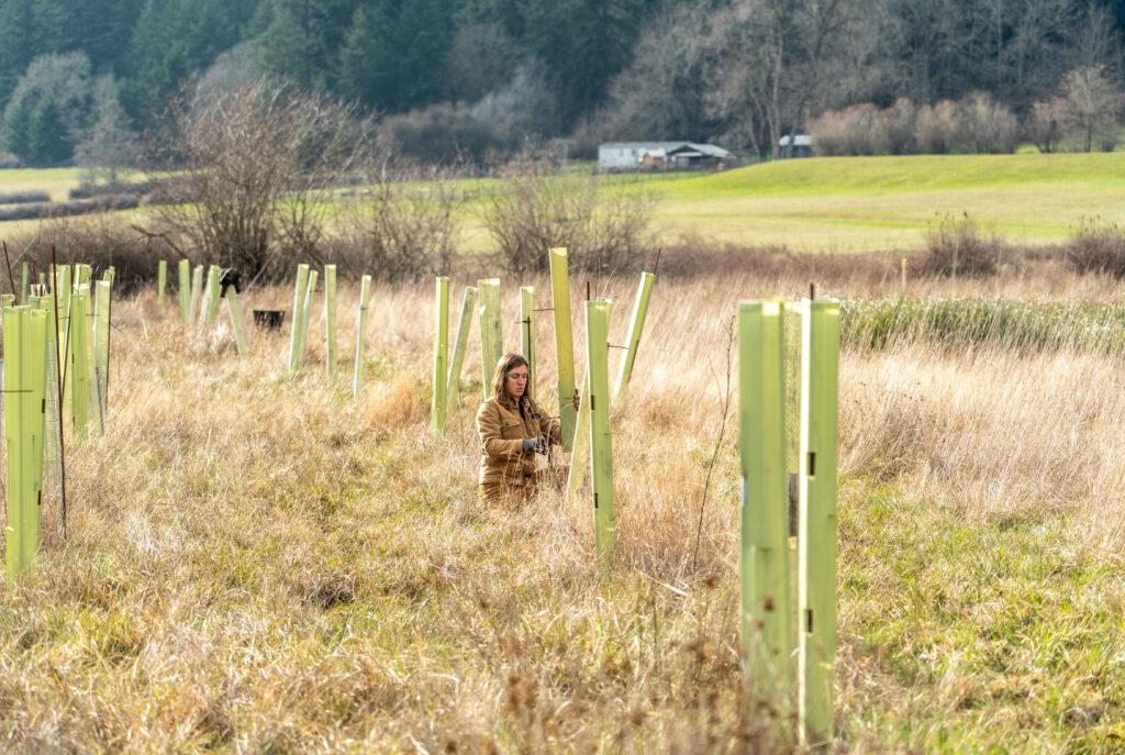 Restoration began in 2024, when SJPT’s stewardship team and the San Juan Islands Conservation District planted more than 500 native wetland trees and shrubs along the creek corridor. Willow, dogwood, and other moisture-loving species were carefully selected for their ability to thrive in saturated soils and stabilize streambanks.